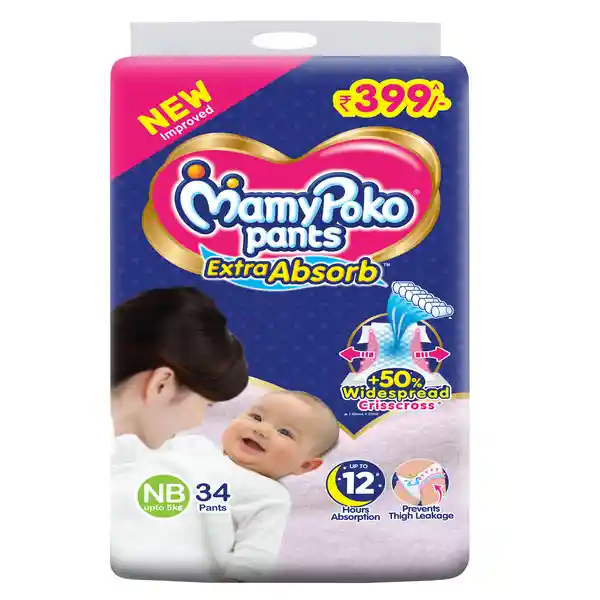 MAMYPOKO PANTS EXTRA ABSORB BABY DIAPERS NEWBORN/X-SMALL (NB/XS), 34 PCS,UPTO 5 KG